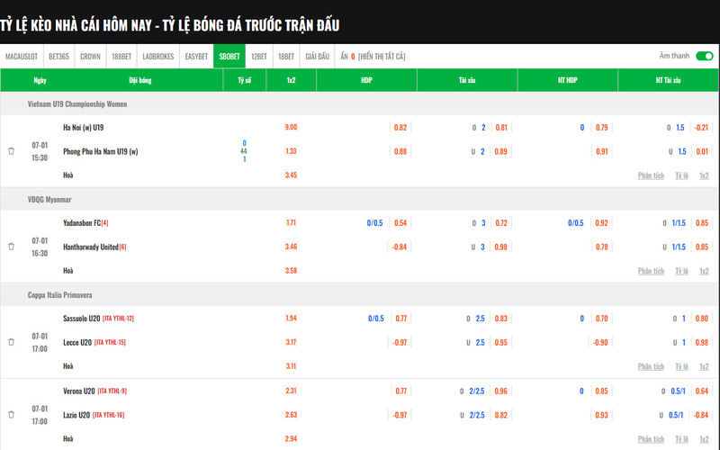 Chúng tôi cung cấp đầy đủ các loại kèo bóng đá trực tuyến, từ kèo châu Á, kèo châu Âu đến kèo tài xỉu. Người hâm mộ có thể theo dõi tỷ lệ cược của mọi trận đấu, cả trong nước và quốc tế, giúp trải nghiệm bóng đá trực tuyến trở nên toàn diện và hấp dẫn hơn.